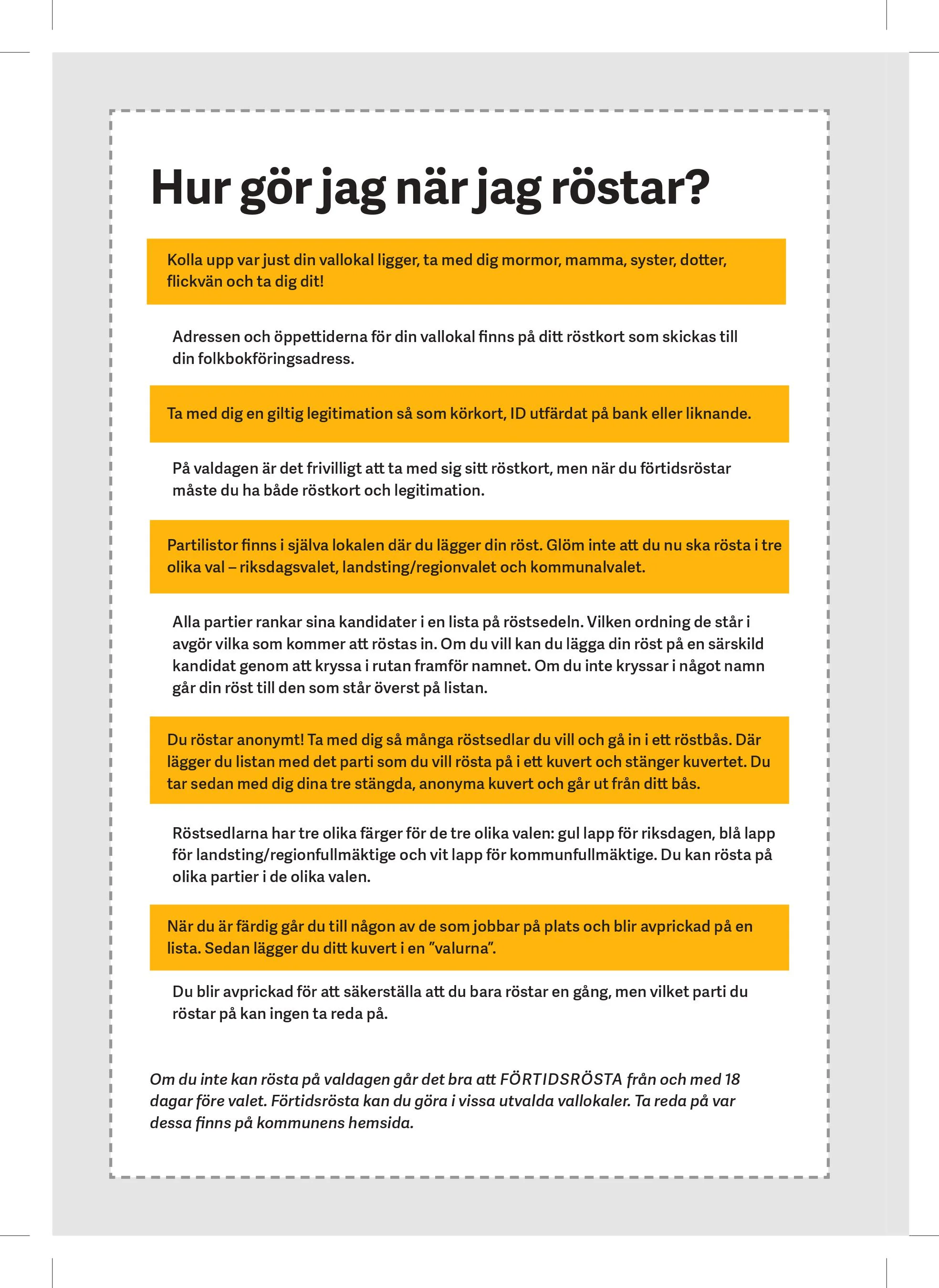 För rösträtt måste du ha fyllt 18 år. Rösträtt till riksdagen om du är svensk medborgare. Rösträtt till kommun- och landstingsfullmäktige om du har varit folkbokförd i Sverige i 3 år.
