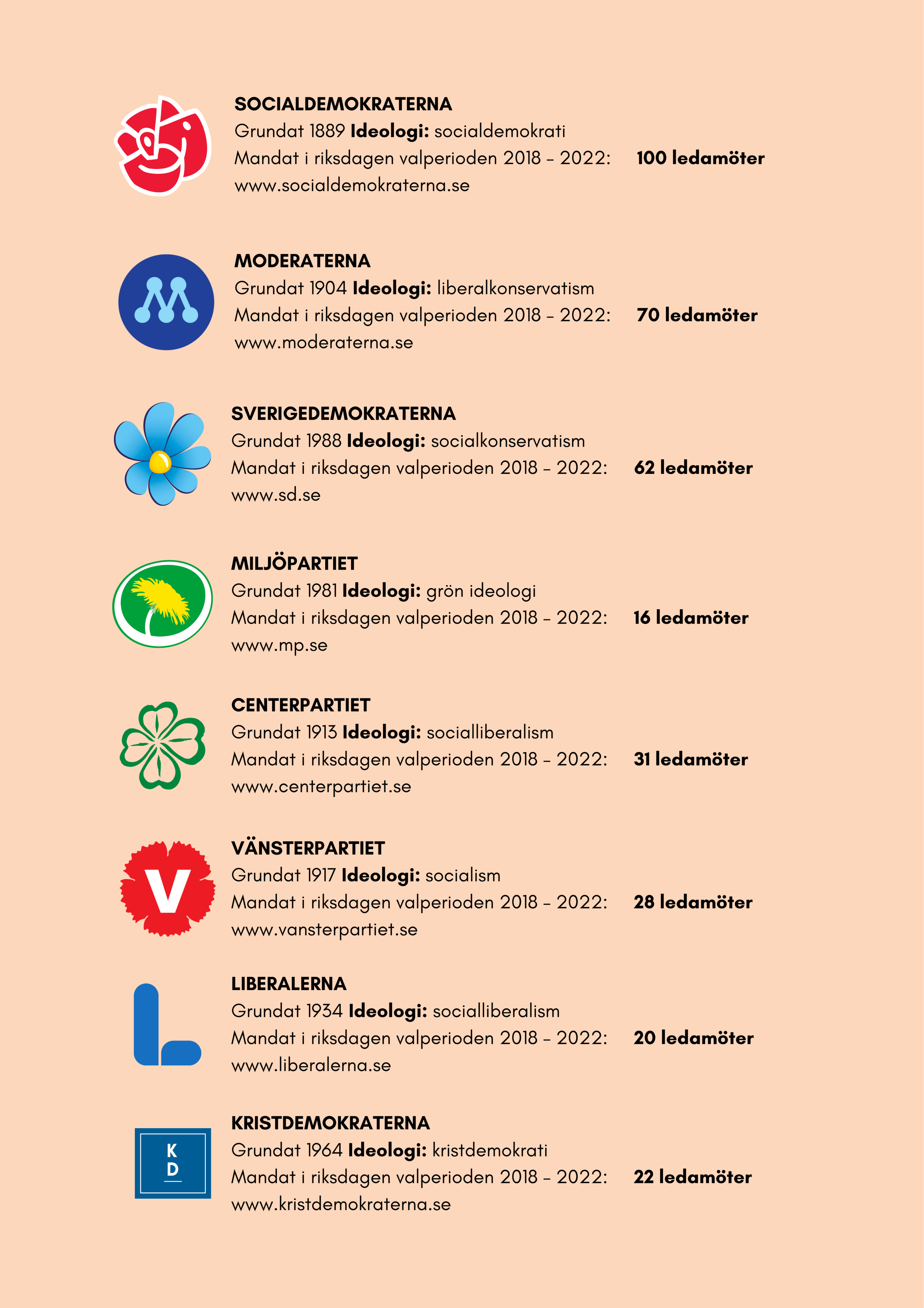 De politiska partierna har sin bakgrund i olika rörelser som vill förändra samhället åt något håll. Rörelserna - som utvecklats till partier - grundar sig på olika idéer om hur samhället bör se ut, vilket ofta kallas för partiernas ideologi. Ideologierna ger en allmän bild av partiernas vision för samhället, deras människosyn, samt statens roll och ansvar. I tabellen står den ideologi partiet själv anser sig ha.